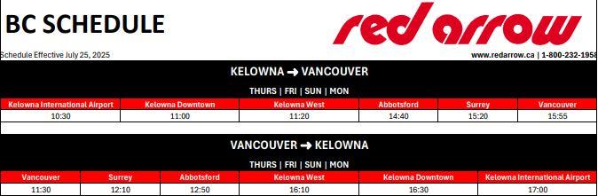 Red Arrow provides the same reliable service as Ebus, operating between YXX Terminal and key destinations including Vancouver, Surrey, West Kelowna, Kelowna (Downtown) and Kelowna Airport, with convenient pick-up and drop-off at YXX. Red Arrow provides a premium motorcoach experience featuring reserved seating in a spacious 2-1 layout, onboard Wi-Fi, power outlets, tray tables, and complimentary snacks and beverages included in the fare.